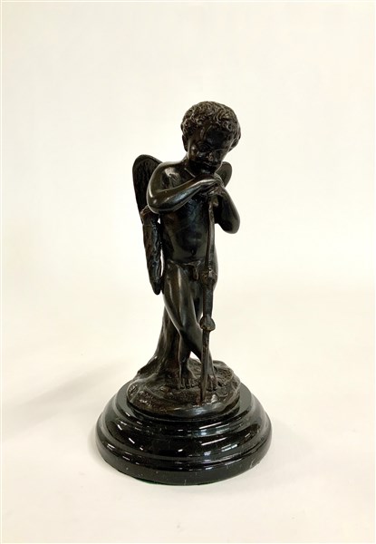 Lotto 384 | Firma indecifrata "Cupido" scultura in bronzo poggiante su base in marmo nero (