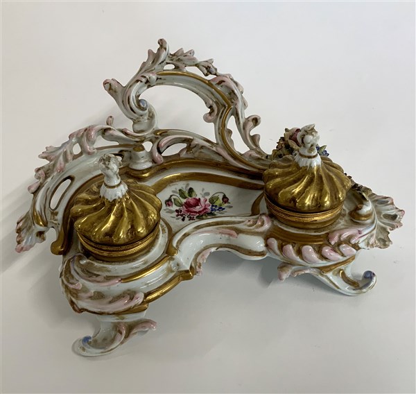 Calamaio in porcellana di forma mossa decorato in policromia a motivi floreali (difetti)