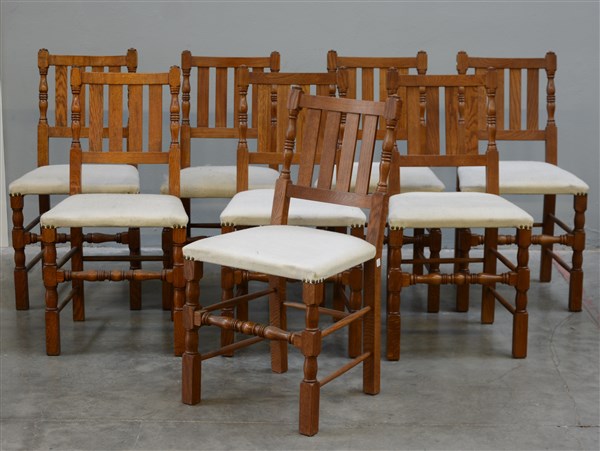 Gruppo di otto sedie in rovere con schienale a giorno, gambe anteriori e traverse tornite