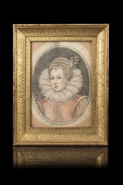 Scuola del secolo XIX "Ritratto di nobildonna" carboncino e matite colorate su carta (cm 13x10) In cornice rivestita in carta dorata, iscrizione al retro