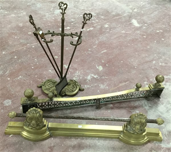 Lotto composto da cinque elementi per camino: due ferma cenere e un porta attrezzi in bronzo con pinza e paletta, epoche differenti (difetti)