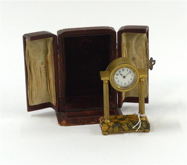 ANONIMO. Piccolo orologio a tempietto in ottone con base in marmo. Epoca secolo XX. Movimento con carica manuale. Quadrante in smalto bianco con numeri arabi. Misura h. cm 8,5. In custodia originale. (difetti)
