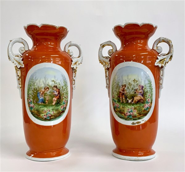 Coppia di vasi biansati in porcellana dipinti con scene campestri entro riserva su fondo arancione (h. cm 38) (difetti)