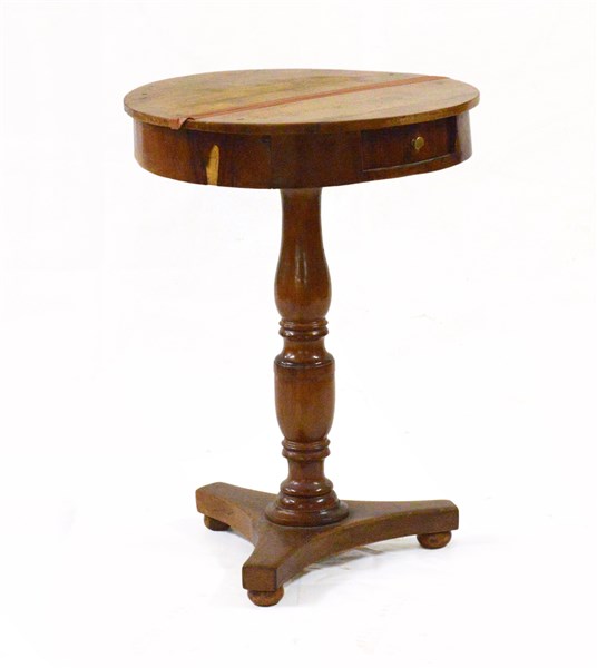 Tavolino da salotto di forma circolare con cassetto nella fascia, colonna tornita terminante in tre piedi a cipolla, basamento mosso. Secolo XIX (d. cm 52; h. cm 71) (difetti)