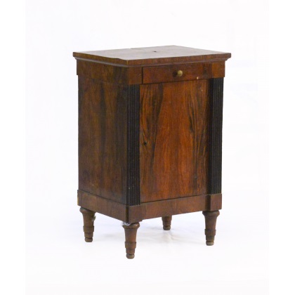Comodino lastronato in noce ad un'anta con cassetto, montanti ebanizzati a mezza colonna scanalata, piedi torniti. Secolo XIX (cm 50x80x41) (difetti)