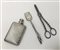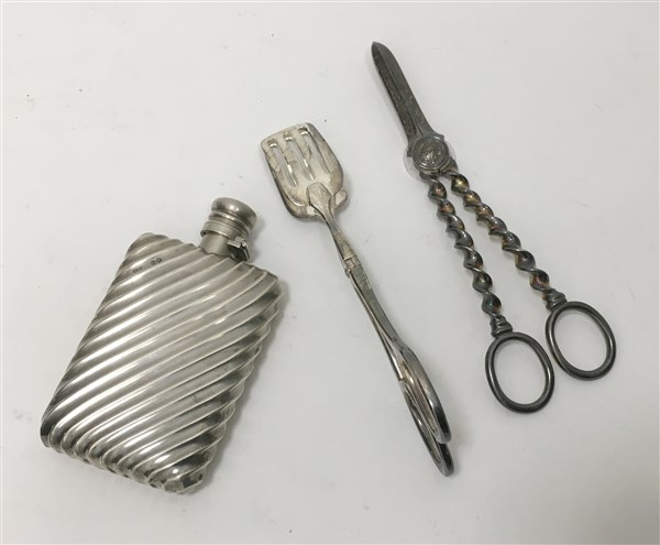 Lotto composto da una bottiglia porta liquori da tasca con punzoni inglesi, una pinza da ghiaccio in argento ed un rompi chele in metallo argentato (g lordi 140 ca.) (difetti)