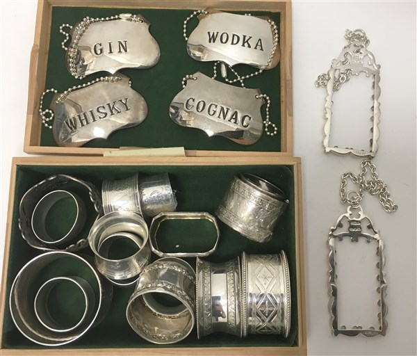 Scatola contenente diversi portatovaglioli ed altri oggetti in metallo argentato (lievi difetti)