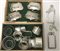 Scatola contenente diversi portatovaglioli ed altri oggetti in metallo argentat