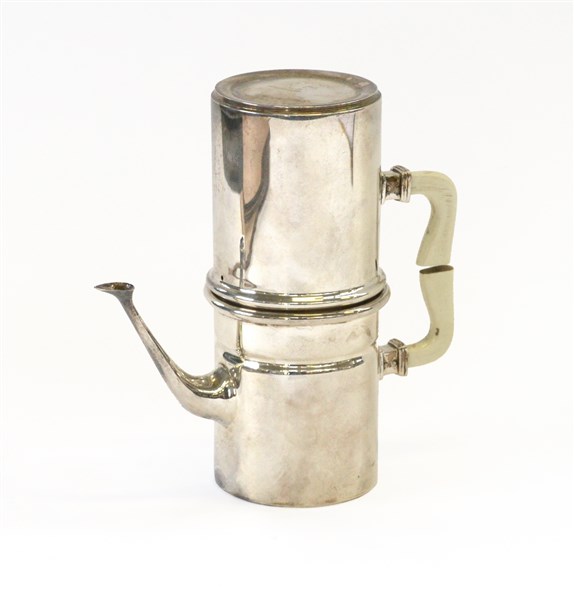 Caffettiera con tazza in argento a corpo liscio, anse in avorio. Titolo 800. Ma