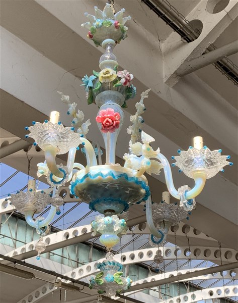 Manifattura di Murano, seconda metà secolo XIX. Lampadario a quattro fiamme in vetro opalino e opalescente decorato con catene e fiori policromi (h. cm 100) (difetti).