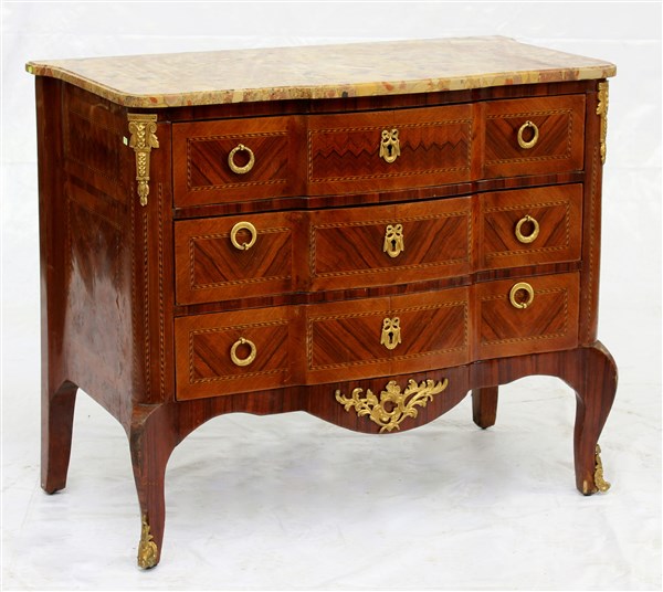 Lotto 469 | Piccolo comò a tre cassetti con fronte lievamente mossa, lastronato e decorato