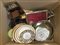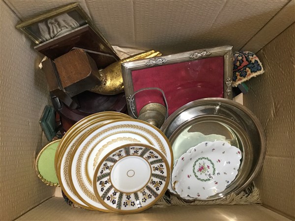 Cartone contenente diversi oggetti di manifatture diverse tra cui una cornice portafoto in argento con punzoni inglesi (difetti)
