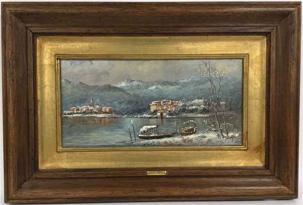 (Attribuito) "Paesaggio lacustre" olio su compensato (cm 19x39) In cornice