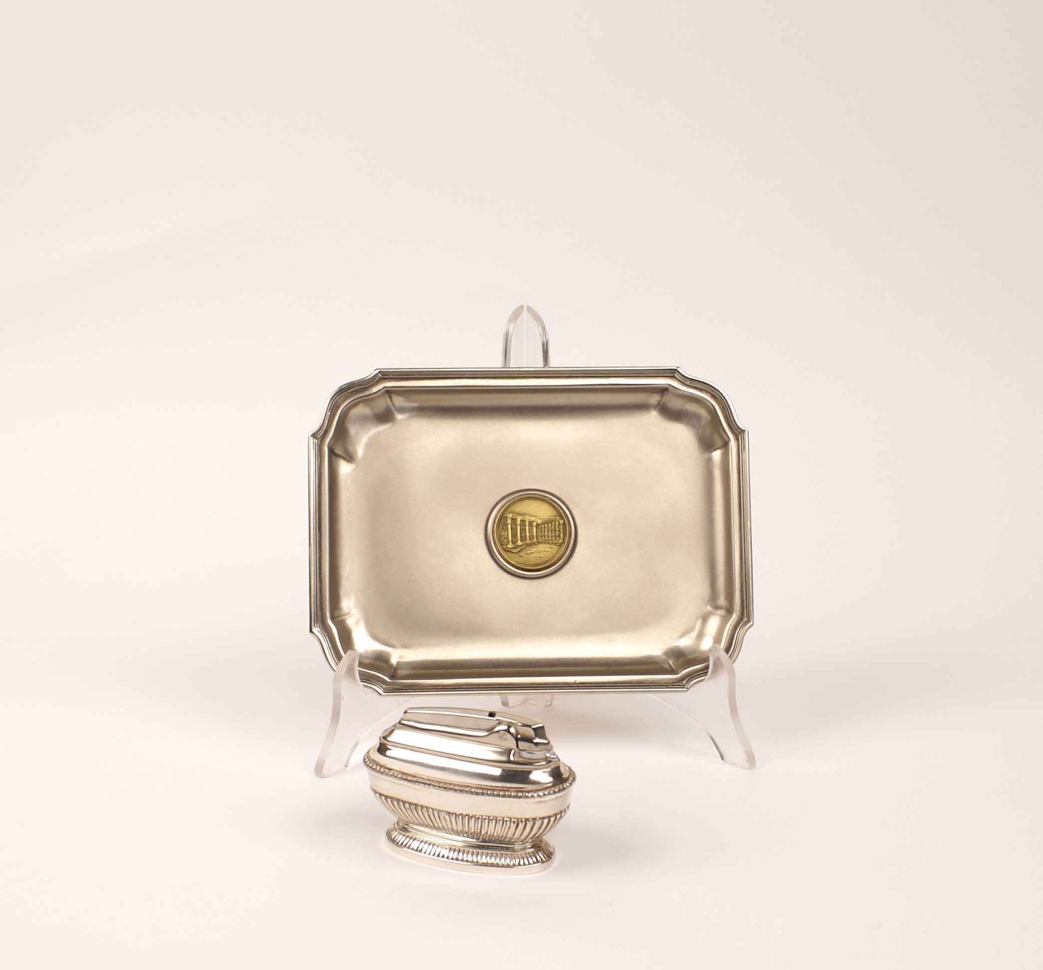 LOTTO DI DUE OGGETTI IN METALLO Composto da un accendino Ronson e un piccolo vassoietto
