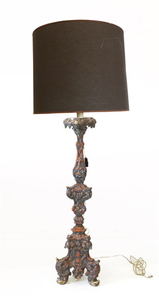 Portacero in legno scolpito e argentato a motivi vegetali e volute. Secolo XIX (h. cm 113) (difetti)