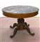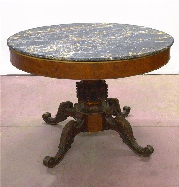 Tavolo tondo con fascia radicata, gamba centrale intagliata terminante a quattro piedi sagomati e scolpiti, piano in marmo nero, secolo XIX (d cm 110x h cm 80) (difetti, restauri e mancanze)