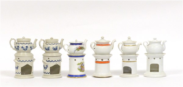 Gruppo di sei veilleuse in porcellana di diverso decoro e manifattura (difetti e mancanze)