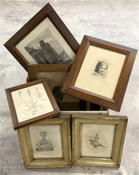 Cartone contenente nove incisioni di soggetto ed epoche differenti, in cornici (difetti)