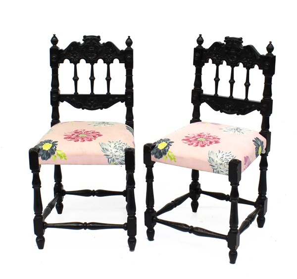 Coppia di sedie in legno ebanizzato con schienali a giorni e montanti torniti, sedute con tessuto a fiori (difetti)