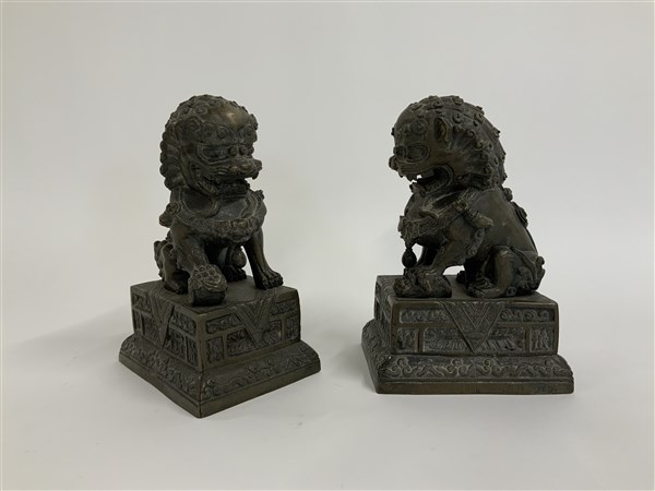 Coppia di leoni buddhisti in bronzo su basi ornate (h cm 22) (difetti) Cina, fi