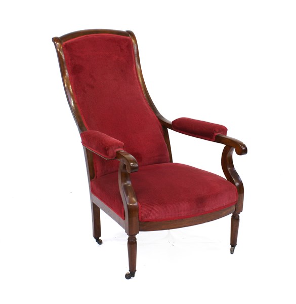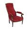 Poltrona da riposo con struttura in noce, seduta e spalliera rivestita in tessuto rosso, piedi con rotelle (difetti)