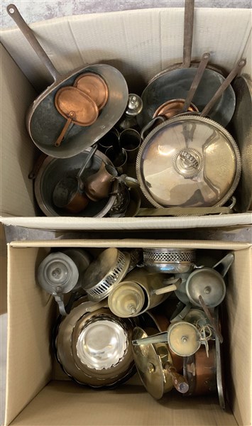 Lotto 566 | Lotto di due cartoni contenenti numerosi oggetti per la tavola in rame ed altri