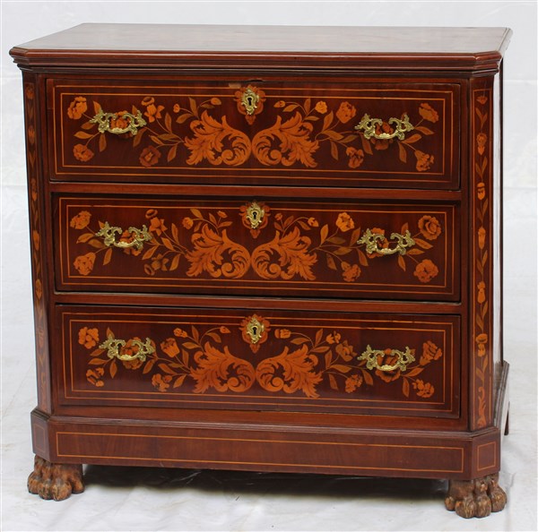 Piccolo comò a tre cassetti in stile olandese decorato con intarsi a motivi floreali, piedi anteriori a zampa ferina. Fine secolo XIX (cm 88x82x50) (difetti)