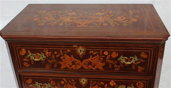 Piccolo comò a tre cassetti in stile olandese decorato con intarsi a motivi flo