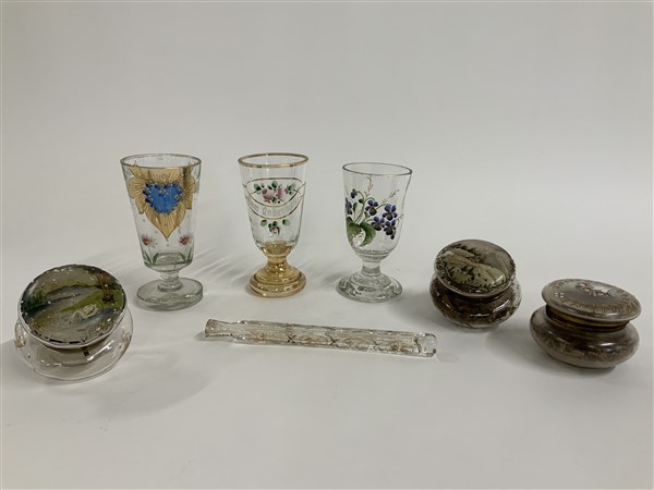 Lotto composto da tre bicchieri, tre porta essenze e una bottiglietta per profumo a forma di fiala, tutti in vetro dipinto con rilievi dorati (difetti)