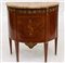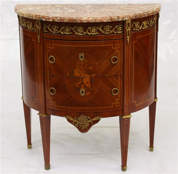 Lotto 583 | Piccola commode demilune con due cassetti, decorata con filettature, piccoli intarsi e guarnizioni in metallo dorato. Piano in marmo (cm 75x80x38)(lievi difetti)