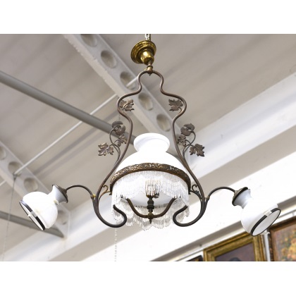 Lampadario a tre luci con struttura mossa in metallo a decoro fogliaceo, paralumi in vetro lattimo. (h cm 112; d cm 100) (difetti e mancanze)
