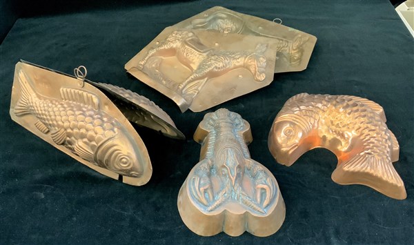 Lotto composto da sei forme da budino sagomate e sbalzate a forma di pesci e as