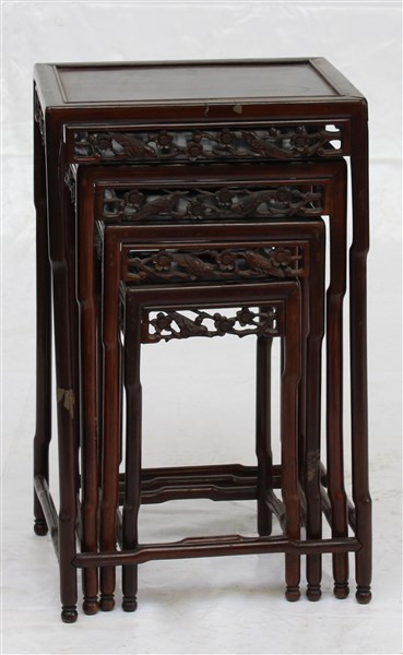 Set di quattro tavolini a nido con grembiali traforati e intagliati. Cina, seco