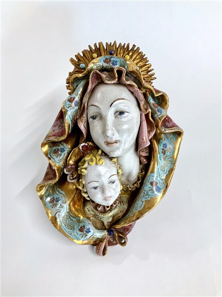 Firma indecifrata, ''Madonna con bambino'', scultura in porcellana policroma fi