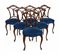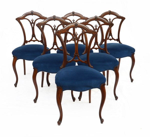 Gruppo di sei sedie in legno con schienale traforato e sedute rivestite in tessuto blu, gambe anteriori di forma mossa e posteriori a sciabola (lievi difetti)
