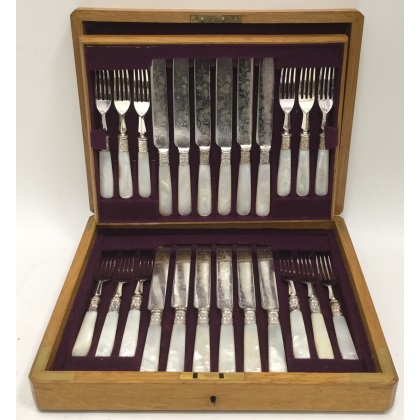 Servizio da dolce composto da sei forchette e sei coltelli metallo argentato e madreperla, in custodia originale (lievi difetti)