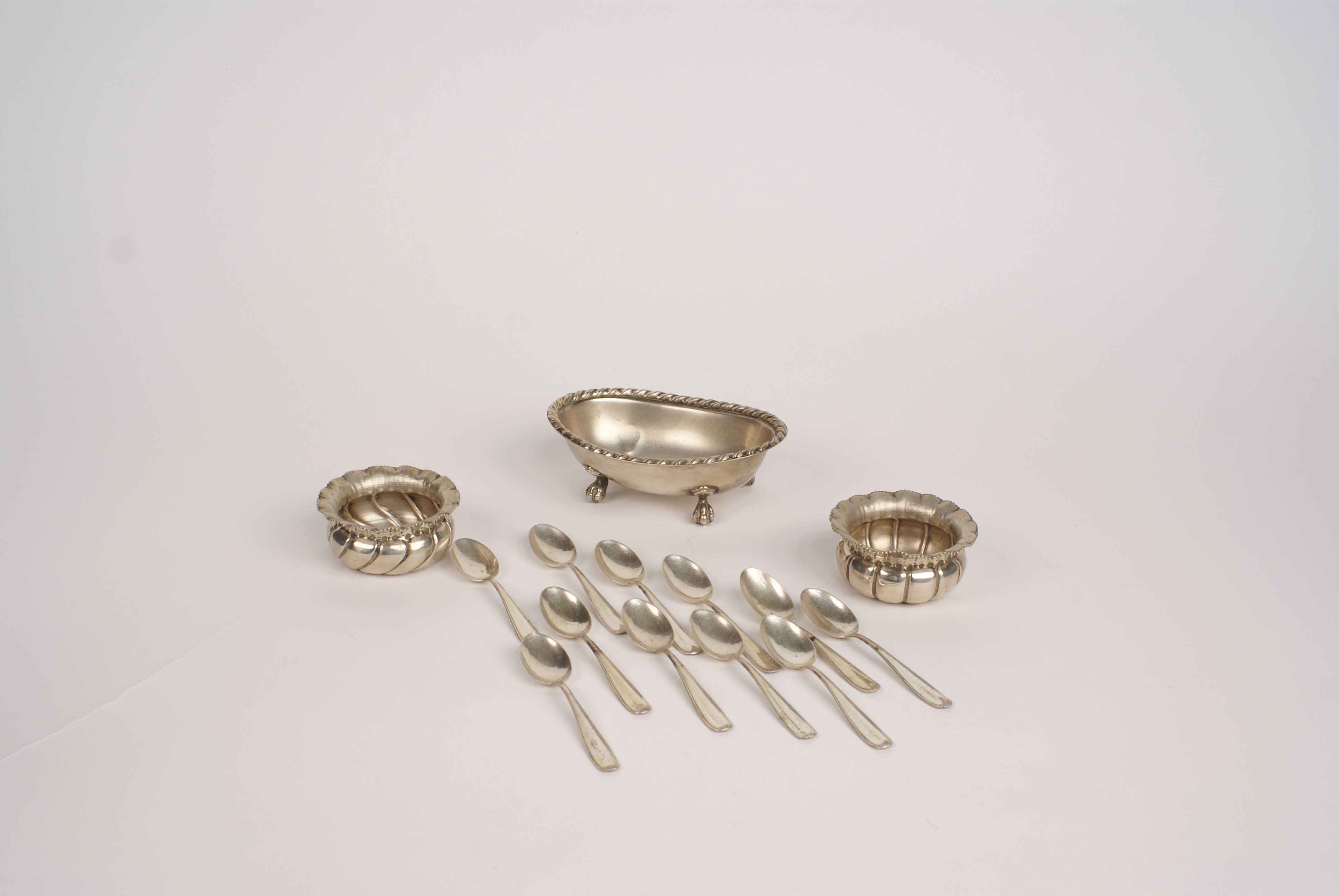 LOTTO IN ARGENTO manifattura italiana Composto da tre oggetti in argento fogge e misure diverse e da undici cucchiaini Peso 330 gr.