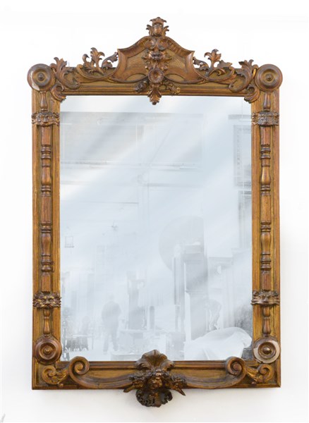 Specchiera in legno intagliato e dorato a mascheroni, volute, motivi vegetali e floreali. Mezze colonne laterali tornite e scanalate (cm 215x137) (difetti e mancanze)