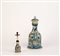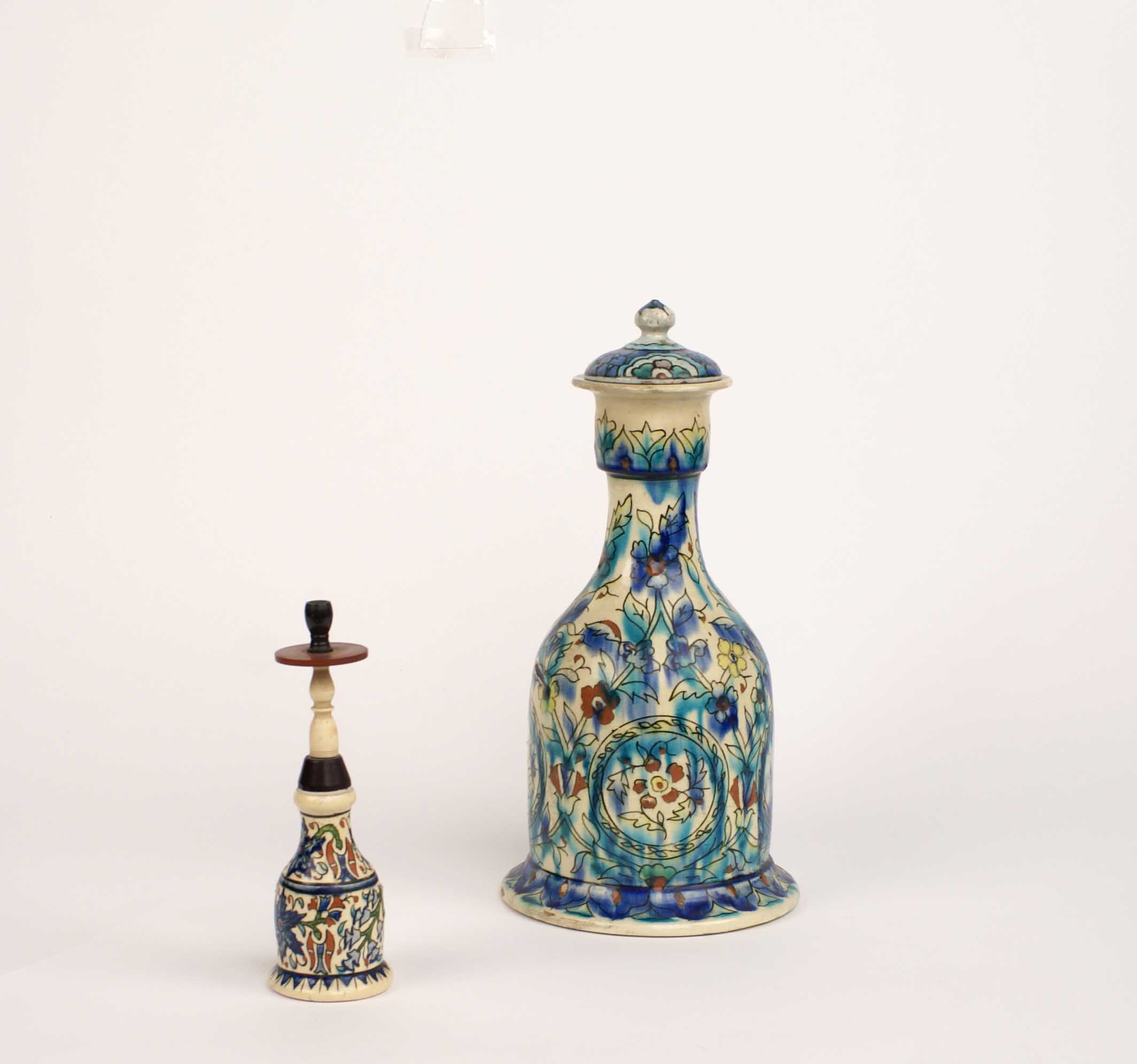 LOTTO DI DUE OGGETTI IN MAIOLICA DIPINTA vecchia manifattura orientale (difetti) H. 28 cm.