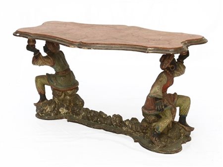 Tavolo da salotto con piano in marmo di forma sagomata, sostegno a figure di mori in legno laccato (cm 113x60x58) Secolo XIX (difetti e mancanze)