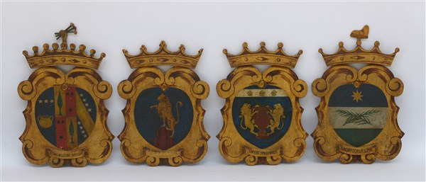 Gruppo di quattro stemmi nobiliari dipinti in policromia e doratura su tavole s