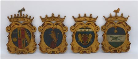 Gruppo di quattro stemmi nobiliari dipinti in policromia e doratura su tavole sagomate (h. max cm 40) (difetti)