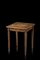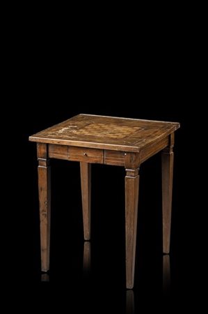 Tavolo da centro lastronato in noce ed intarsiato, il piano con scacchiera, un cassetto nella fascia, gambe ad obelisco rovesciato. Secolo XVIII (cm 51x63x51) (difetti)