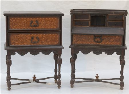 Coppia di antichi comodini in noce con fronte intarsiato e filettato in legno chiaro a girali fogliate e volatili. Sostegni torniti riuniti da traverse (cm 79,5x104x41) (difetti e restauri)