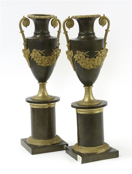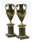 Coppia di vasi biansati in metallo centrati da applicazioni di foglie e fiori, anse a ricciolo terminanti a protomi. Basi a plinto (h. cm 37) (difetti)
