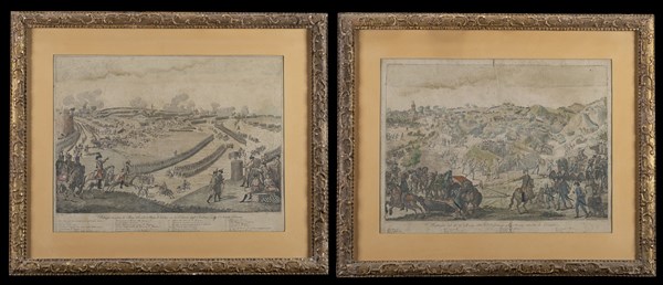 Luigi Frisoni. Le battaglie di Bussolengo e Verona 1799. Coppia di acqueforti a colori (mm 330x435) In cornici in legno e pastiglia dorate (difetti)