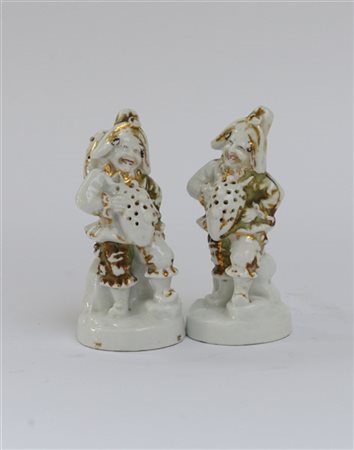 Manifattura del secolo XIX. Coppia di figure in porcellana raffiguranti personaggi grotteschi decorate in policromia (h. cm 12) (difetti)