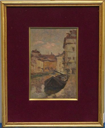 "Barcone sul Naviglio" olio su tavola (cm 17x11.5) Firmato in basso a destra. In cornice