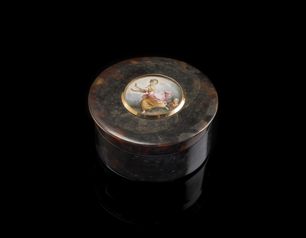 Tabacchiera in tartaruga di forma tonda decorata sul coperchio con miniatura in