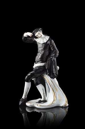 Manifattura tedesca, secolo XIX. Figura in porcellana policroma raffigurata sed